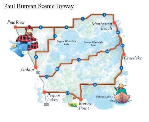 The Paul Bunyan Scenic Byway is a 54-mile driving route made up entirely of county roads, that take travelers through 14 jurisdictions and two counties (Crow Wing and Cass); with hiking and walking trails, recreational parks and lakes, wildlife management areas, and historical artifacts. The route has a non-profit organization, the Paul Bunyan Scenic Byway Association, that manages the projects, programs and events along the route.