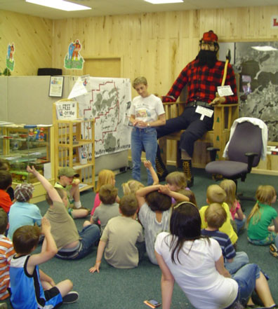Nearly all the students had heard of Paul Bunyan and Babe, his blue ox. The age-old question of whether Paul Bunyan was ever a real person was asked by students from both groups. But, the most fun, by far, was listening to the Bunyan tall tales. The stories were read by PBSBA chair, Lynn Scharenbroich, who also taught the students to sing the Paul Bunyan Scenic Byway jingle.