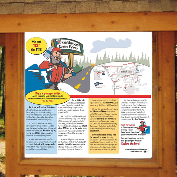 Following a devasting fire on May 31, 1984, the site remained closed until 1989 when the new building you see today was built. Now a relaxed, casual dining spot, the owners invite travelers to stop by for lunch, dinner or just a beverage and a snack. As you drive into the parking lot, look for an interpretive panel kiosk which tells the story of 'Ike the Pike', the meanest, nastiest fish that ever swum these waters - and how Paul Bunyan nearly landed him with his legendary tackle. It also tells of the historic Ojibwe vs. Dakota battle which took place right on this bay many years ago.